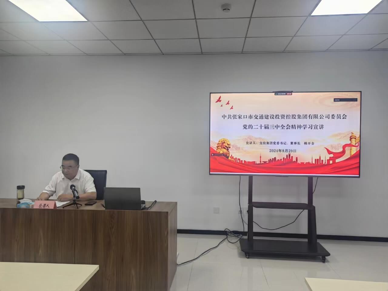 2024年8月29日交投集团党委举行学习贯彻党的二十届三中全会精神宣讲报告会。交投集团党委书记、董事长韩开全为党员干部职工作报告宣讲,交投集团领导班子成员、集团管理中层干部、各党支部书记、委员等共计65人参加会议。